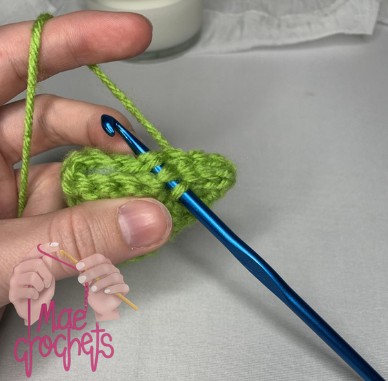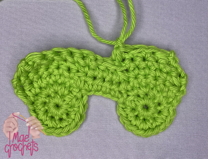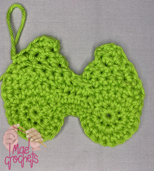 Repeat rows 1 - 2 but DO NOT FASTEN OFF!! You should have two small green circles.